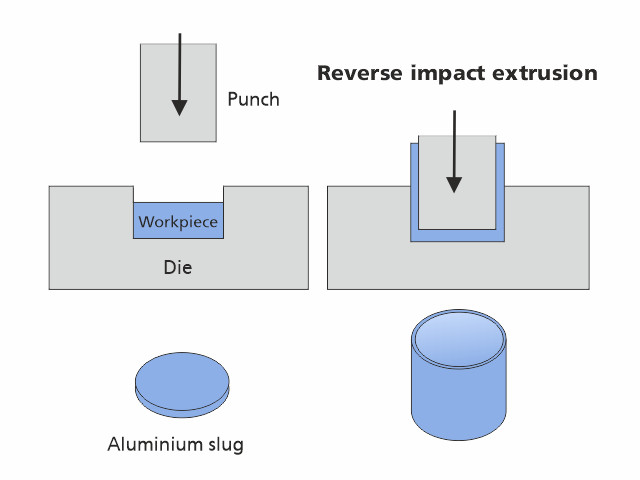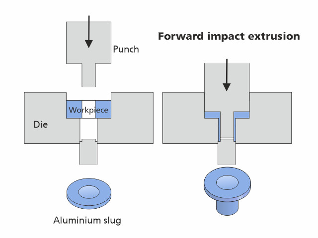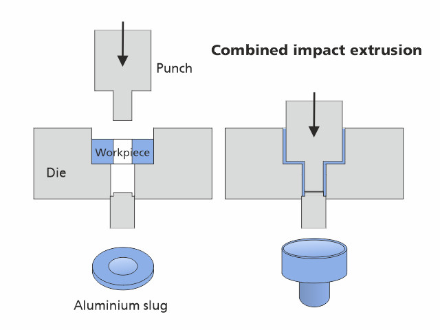 Aluminum blanks (slugs) are placed in a die at room temperature and pressed with a press punch under high pressure in the die. The material immediately begins to flow and adapts to the die and the press plunger in a precise manner. This produces precise workpieces with a high surface quality.